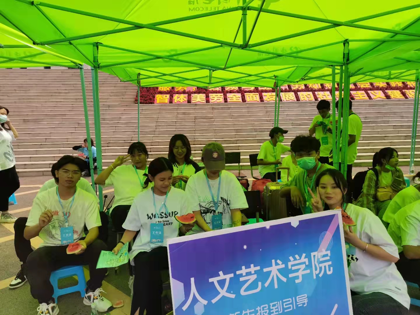 在公司西门,明远楼均有我们系员工会工作人员忙碌的身影。他们给新生们带路、拎行李、找宿舍。大家把自己的微笑带给每一位新生。