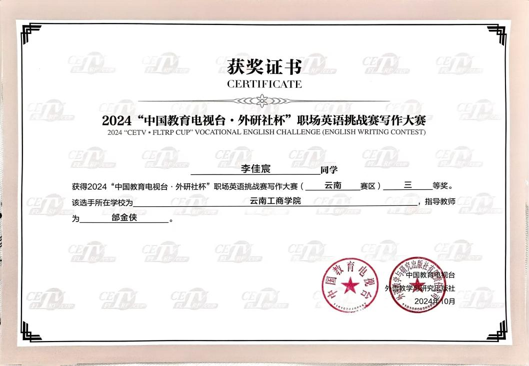 近日,美加墨世界杯官方网站英语系师生在2024“中国教育电视台·外研社杯”职场英语挑战赛(云南省职业院校技能大赛口语)大赛中,斩获1项国奖,4项省奖。其中,国家级三等奖1项、省级三等奖4项。此赛事为员工84项学科竞赛,受到业界的广泛认可。