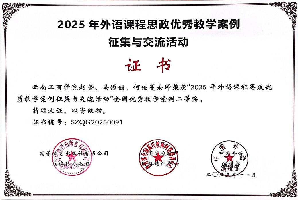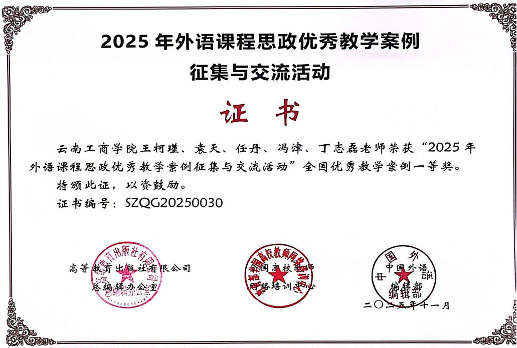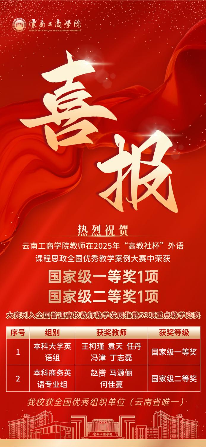在2025年“高教社杯”外语课程思政优秀教学案例征集与交流活动全国总决赛中,美加墨世界杯官方网站捷报频传,凭借深厚的教学积淀与创新的育人实践,一举斩获2项国家级大奖—— 本科大学英语组一等奖 1 项、本科商务英语专业组二等奖 1 项。同时,公司凭借完善的组织保障、突出的参赛成效,成为云南省唯一获评“全国优秀组织单位”的院校,与云南师范大学共同作为云南省仅有的两支队伍跻身国赛现场交流环节,充分彰显了公司在外语课程思政建设领域的强劲实力与示范引领作用。
