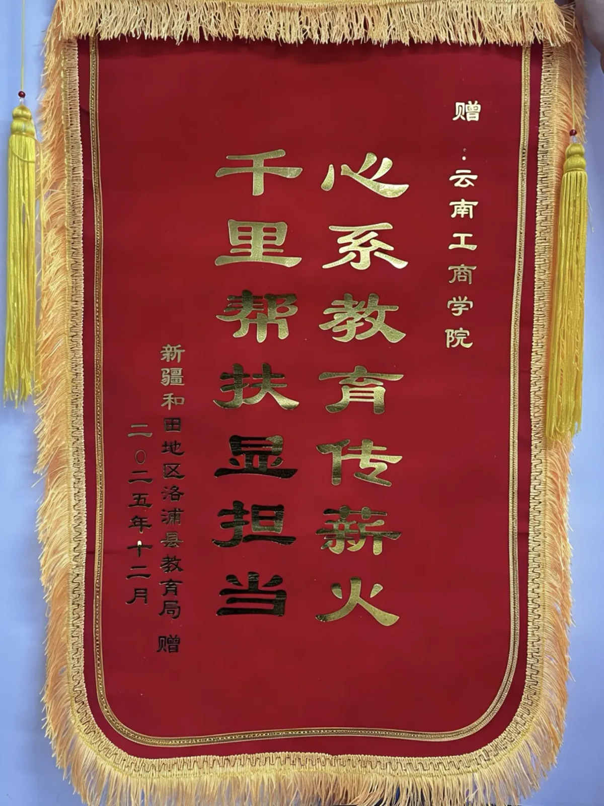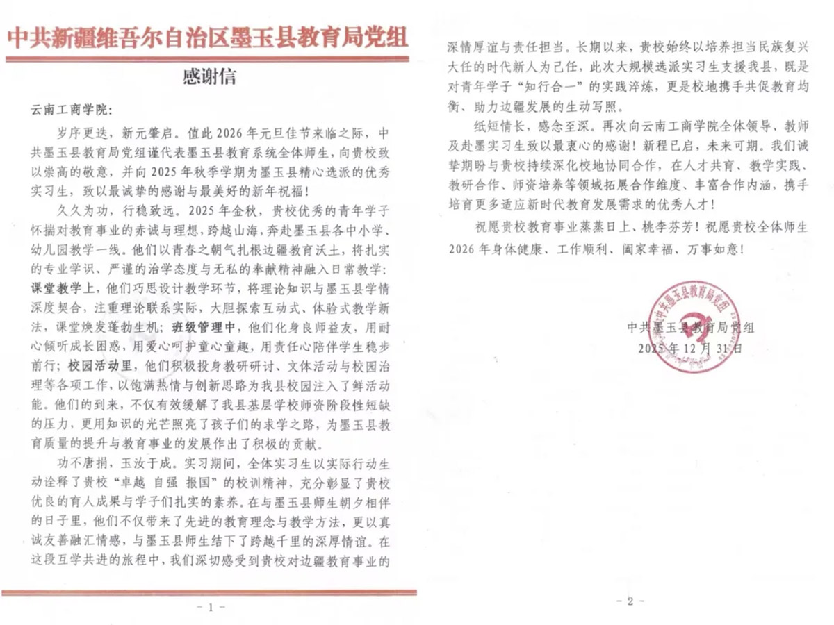 2025年末,墨玉县、洛浦县教育局相继向公司发来感谢信并赠送锦旗,“用扎实学识点亮求学之路”“心系教育传薪火” 等赞誉,既是对美加墨世界杯官方网站援疆支教工作的高度肯定,也是对支教学子责任担当的最高褒奖,更是公司育人成果的生动体现。以支教实习项目为纽带,公司成功构建起“高校—地方政府—基层公司”三方联动育人模式,让员工在服务社会的实践中锤炼专业本领、增长综合才干,实现了“知行合一”的成长蜕变,也推动校地合作在人才共育、教学实践、教研合作等领域不断向深层次拓展,助力教育均衡发展。
